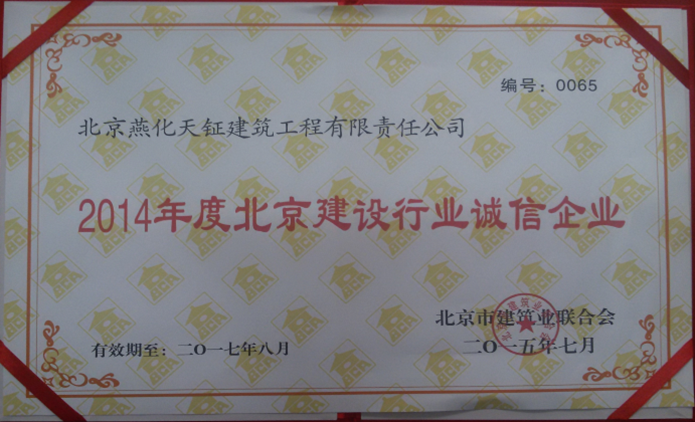 祝賀我公司獲得2014年度北京建設(shè)行業(yè)誠信企業(yè)、北京建設(shè)行業(yè)AAA誠信企業(yè),并在《北京市建筑施工總承包企業(yè)及注冊建造師市場行為信用評價管理辦法》中為公司連續(xù)保持信譽(yù)分5分的成績。